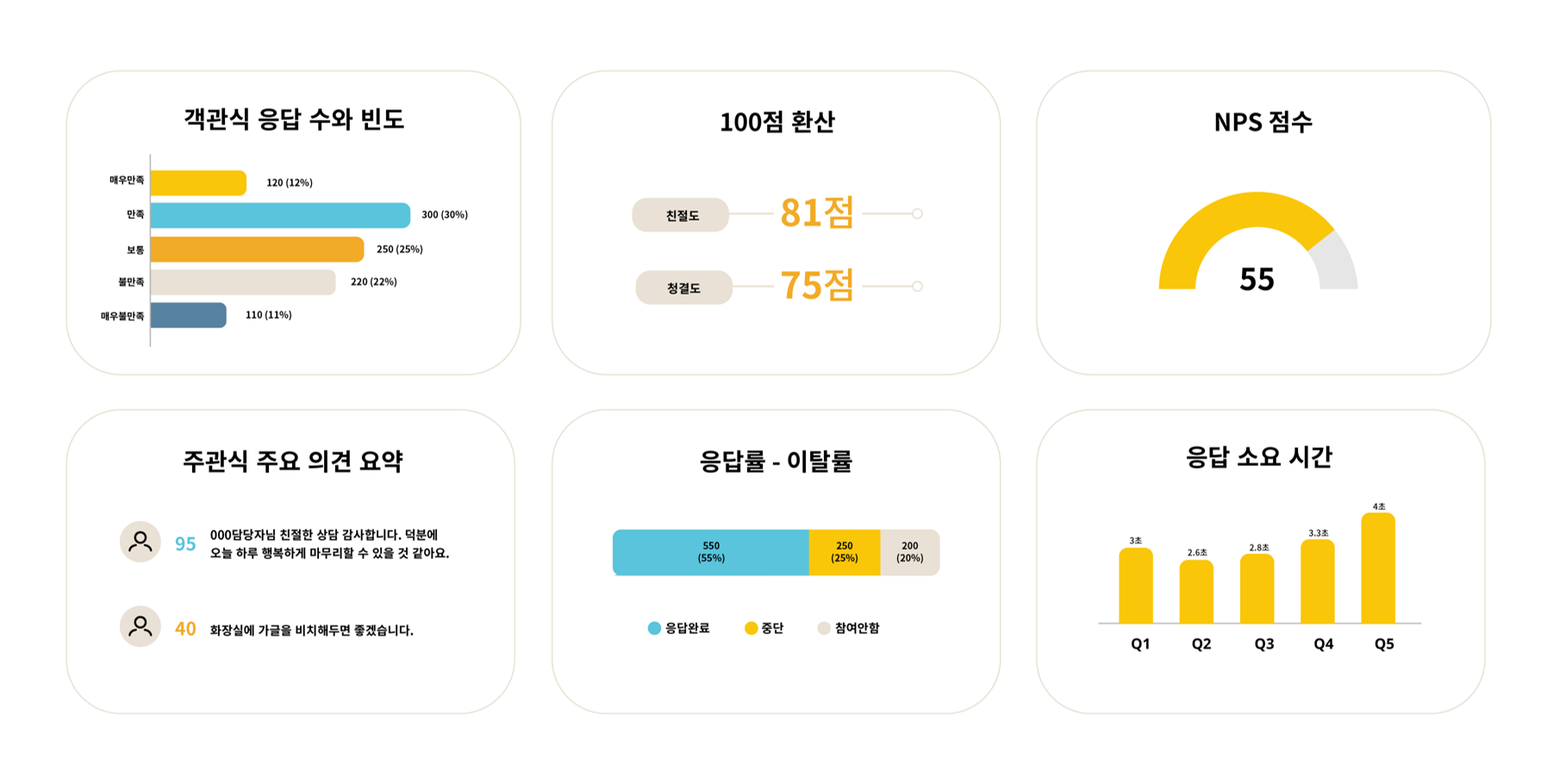 응답 수와 빈도, 환산 분석, NPS 점수, 주관식 의견 요약 등